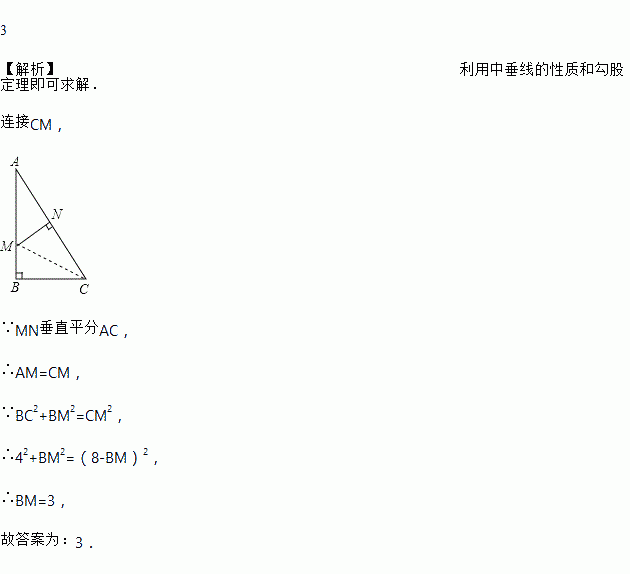 如图,在中,,AB=8,BC=4,AC的垂直平分线交AB于点M,交AC于N,则BM的值为________.