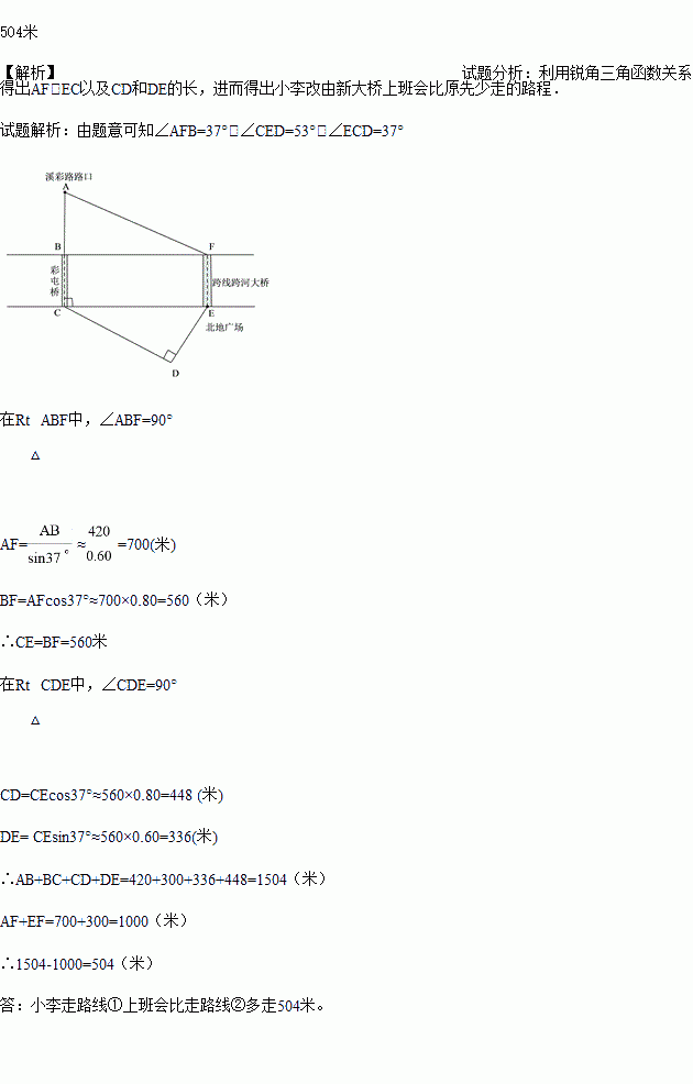如图,兴隆台和盘山市区之间有东、西两座大桥,是美丽盘锦的地标。西桥北侧湖滨公园路口的小李要到东桥南侧的汽配城上班,有两条路线:①为A→B→C→D→E;②为A→F→E.已知BC∥EF,BF∥CE,AB⊥CE,DE⊥CD,AB=420米,BC=300米,∠AFB=37°,∠CED=53°,请你帮助计算一下,小李走路线①上班会比走路线②多走多少米?(结果保留整数)(参考数据:sin37°≈0.60,cos37°≈0.80,tan37°≈0.75)
