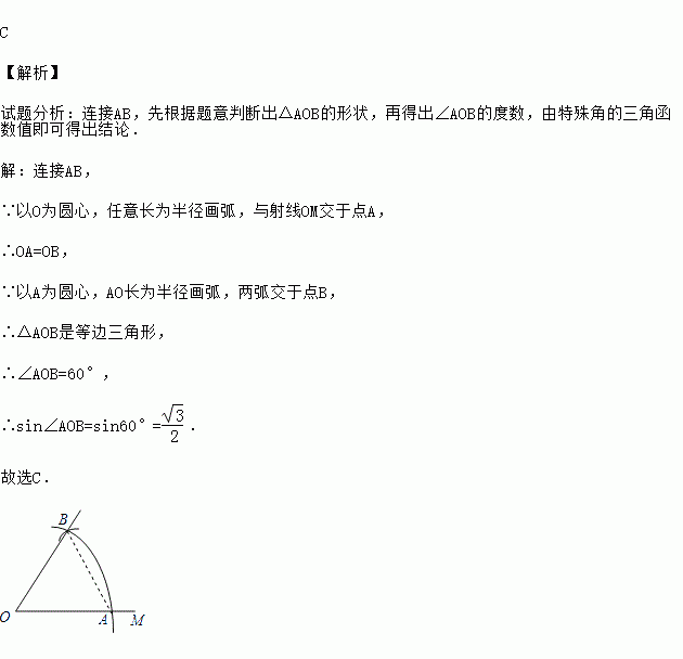 如图,以O为圆心,任意长为半径画弧,与射线OM交于点A,再以A为圆心,AO长为半径画弧,两弧交于点B,画射线OB,则sin∠AOB的值等于( )