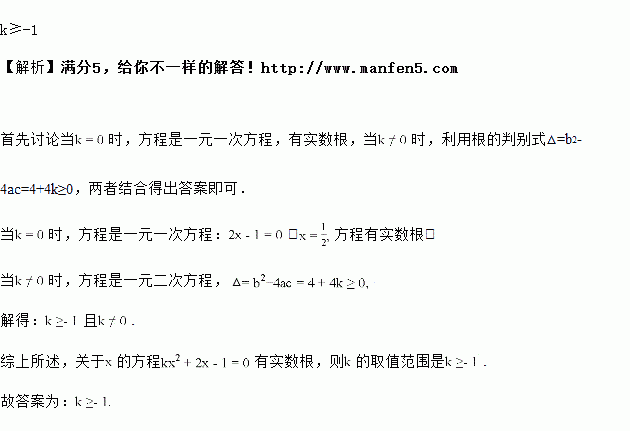 若关于x的方程kx2+2x﹣1=0有实数根,则k的取值范围是_____.