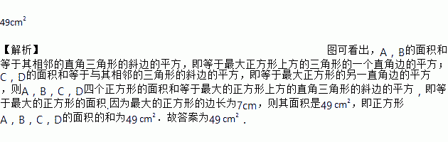 如图所有四边形都是正方形,所有三角形都是直角三角形,其中最大的正方形边长为7cm,则正方形A、B、C、D的面积和为_________