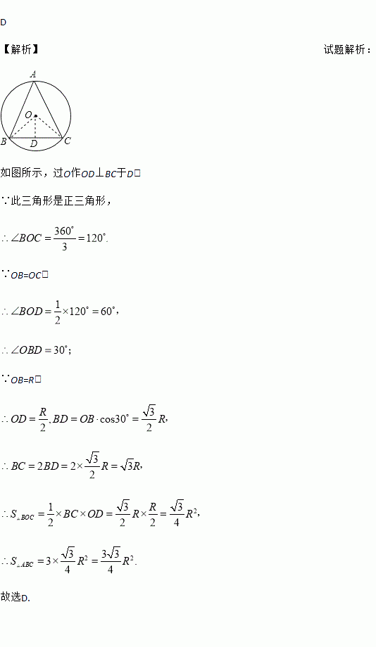 半径为R的圆内接正三角形的面积是 ( )