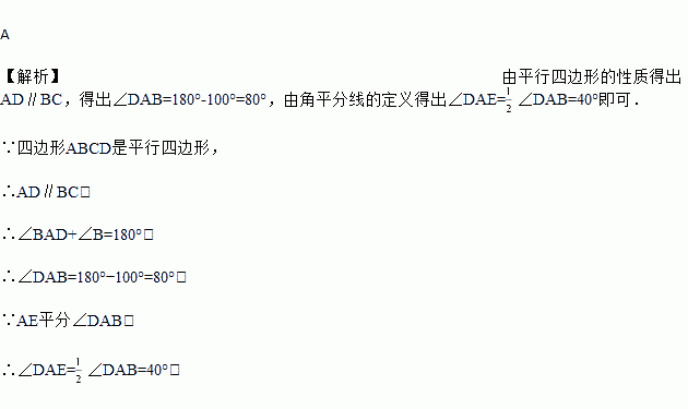 如图, □ABCD中,AE平分∠DAB,∠B=100°则∠DAE等于 ( )