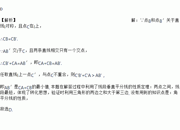 D 【解析】【解析】 ∵点B和点B′关于直线l对称,且点C在l上, ∴CB=CB′. ∵AB′交l于C,且两条直线相交只有一个交点, ∴CB′+CA=AB′,即CA+CB=AB′. 任取直线l上一点C′,与点C不重合,则C′B′+C′A>AB′, 即AB′是CA+CB的最小值. 本题在解答过程中利用了线段垂直平分线的性质定理:两点之间,线段最短,体现了转化思想...