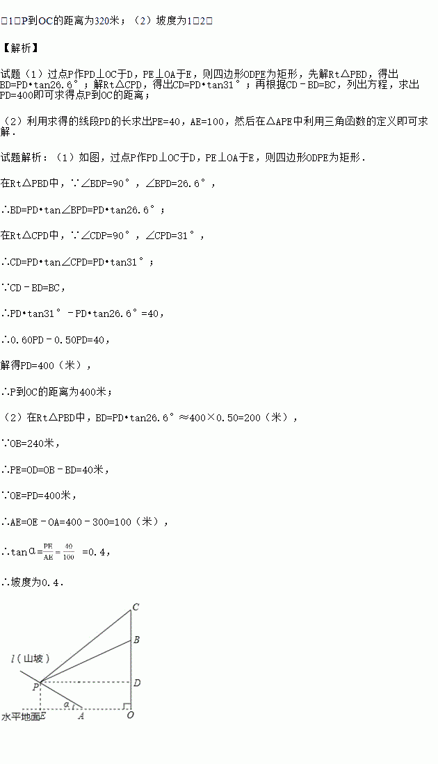 如图,某工程队准备在山坡(山坡视为直线l)上修一条路,需要测量山坡的坡度,即tanα的值.测量员在山坡P处(不计此人身高)观察对面山顶上的一座铁塔,测得塔尖C的仰角为37°,塔底B的仰角为26.6°.已知塔高BC=80米,塔所在的山高OB=220米,OA=200米,图中的点O、B、C、A、P在同一平面内.