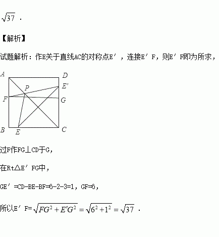 如图,正方形ABCD的边长为6,E为BC上的一点,BE=2,F为AB上的一点,AF=3,P为AC上一点,则PF+PE的最小值为 .