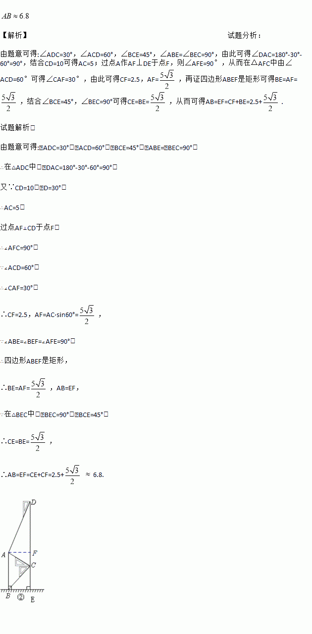 (如图②).若已知CD为10米,请求出雕塑AB的高度.(结果精确到0.1米,参考数据