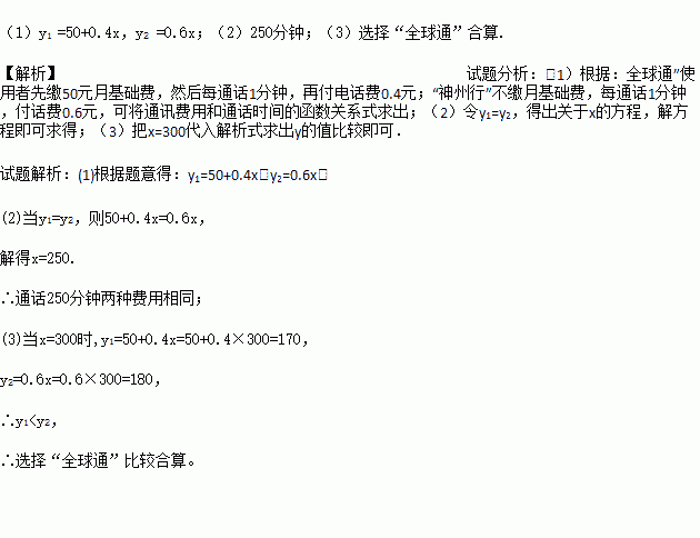 某移动公司开设了两种通信业务:“全球通”要缴月租费50元。另外每分钟通话费0.4元;“神州行”不缴月租费,但每分钟通话费0.6元.若一个月通话