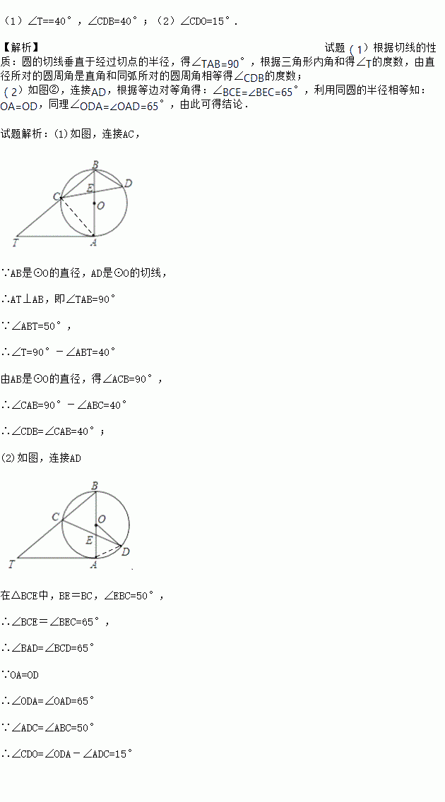 已知AB是⊙O的直径,AT是⊙O的切线,∠ABT=50°,BT交⊙O于点C,E是AB上一点,延长CE交⊙O于点D.