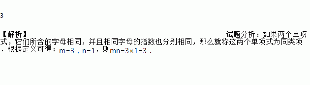 3 【解析】试题分析:如果两个单项式,它们所含的字母相同,并且相同字母的指数也分别相同,那么就称这两个单项式为同类项.根据定义可得:m=3,n=1,则mn=3×1=3.