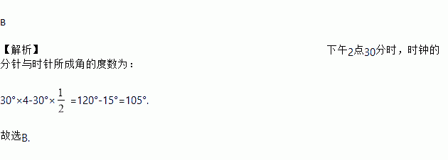 B 【解析】下午2点30分时,时钟的分针与时针所成角的度数为: 30°×4-30°×=120°-15°=105°. 故选B.
