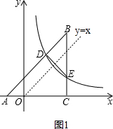 3.分析 首先设点D的坐标是(m,$\frac{3}{m}$),点E的坐标是(n,$\frac{3}{n}$),应用待定系数法求出直线AB的解析式是多少;然后根据△BDE∽△BCA,可得∠BDE=∠BCA=90°,推得直线y=x与直线DE垂直,再根据点D、E关于直线y=x对称,推得mn=3;最后根据点D在直线AB上,求出点n的值是多少,即可判断出点E的坐标是多少.