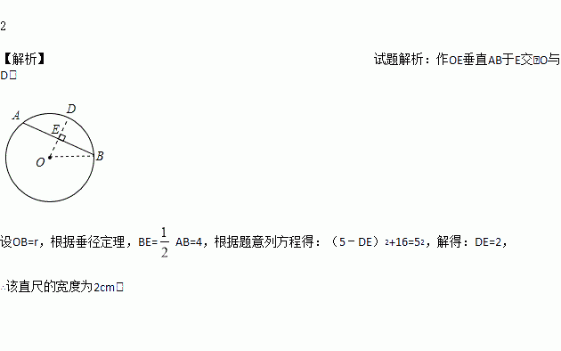 如图,两边平行的刻度尺在圆上移动,当刻度尺的一边与直径为10cm的圆相切时,另一边与圆两个交点处的读数恰好为“4”和“12”(单位:cm),则刻度尺的宽为____cm.