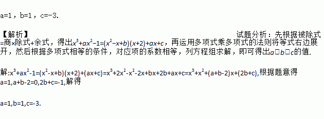 a=1,b=1,c=-3. 【解析】试题分析:先根据被除式=商×除式+余式,得出x3+ax2?1=(x2?x+b)(x+2)+ax+c,再运用多项式乘多项式的法则将等式右边展开,然后根据多项式相等的条件,对应项的系数相等,列方程组求解,即可得出a,b,c的值. 解:x3+ax2-1=(x2-x+b)(x+2)+(ax+c)=x3+2x2-x2-2x+bx+2b+ax+c=x3+x2+(...