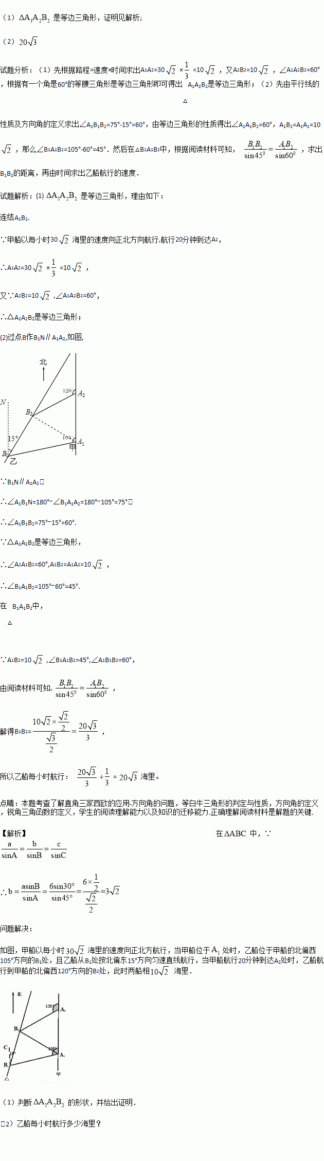 在一个三角形中,各边和它所对角的正弦的比相等.即 .利用上述结论可以求解如下题目.如: