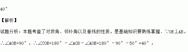 如图,直线AB,CD交于点O,OE⊥AB,若∠AOD=50°,则∠COE的度数为 .