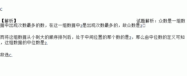 C 【解析】试题解析:众数是一组数据中出现次数最多的数,在这一组数据中2是出现次数最多的,故众数是2; 而将这组数据从小到大的顺序排列后,处于中间位置的那个数的是2,那么由中位数的定义可知,这组数据的中位数是2. 故选C.