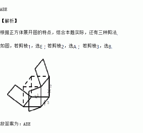 如图中有两个图,左图是一个没有完全剪开的正方体,若再剪开一条棱,则得到的平面展开图可能是右图六种图形A、B、C、D、E、F中的_________.(填写字母,多填错填得0分,每对一个,得1分)