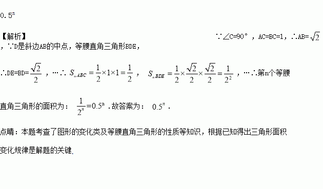 如图,△ABC是第1个等腰直角三角形,∠C=90°,AC=BC=1,D是斜边AB的中点,以BD为一直角边向形外作第2个等腰直角三角形BDE,……,如此继续下去,第n个等腰直角三角形的面积为________.