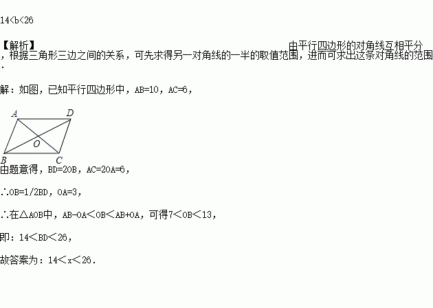 平行四边形一边长为10,一条对角线长为6,则它的另一条对角线长b的取值范围为 .