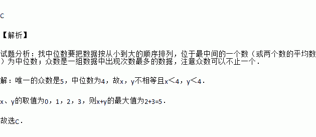 C 【解析】 试题分析:找中位数要把数据按从小到大的顺序排列,位于最中间的一个数(或两个数的平均数)为中位数;众数是一组数据中出现次数最多的数据,注意众数可以不止一个. 【解析】 唯一的众数是5,中位数为4,故x,y不相等且x<4,y<4. x、y的取值为0,1,2,3,则x+y的最大值为2+3=5. 故选C.