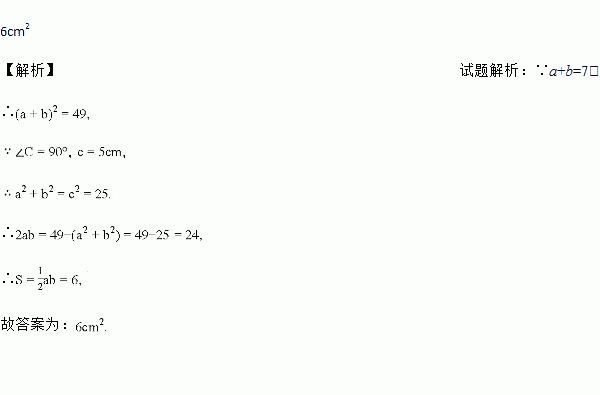 在△ABC中,∠C=90°,若a+b=7cm,c=5cm,则△ABC的面积为_________.