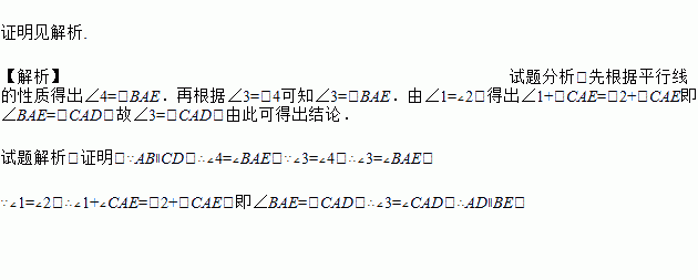 如图,BCE、AFE是直线,AB∥CD,∠1=∠2,∠3=∠4,求证:AD∥BE.