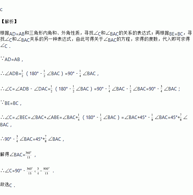 AD与BE是△ABC的角平分线,D,E分别在BC,AC上,若AD=AB,BE=BC,则∠C=( )