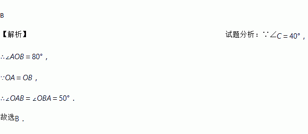 如图,△ABC内接于⊙O,连接OA,OB,∠C=40°,则∠OBA的度数是( )