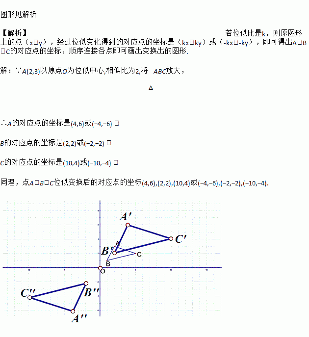 如图,A(2,3),B(1,1),C(5,2)以原点O为位似中心,相似比为2, 将△ABC进行变换,画出变换后的图形,并求出相应的坐标.