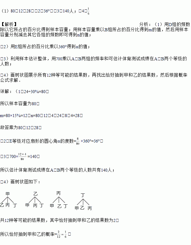 4)我校决定从本次抽取的A等级学生(记为甲、乙、丙、丁)中,随机选择2名成为学校代表参加全市体能竞赛,请你用列表法或画树状图的方法,求恰好抽到甲和乙的概率.