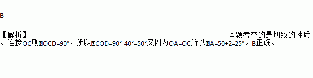 B 【解析】本题考查的是切线的性质。连接OC则∠OCD=90°,所以∠COD=90°-40°=50°又因为OA=OC所以∠A=50÷2=25°。B正确。