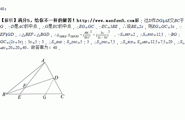 如图,△ABC中,点D是AC中点,点E在BC上且EC=3BE,BD、AE交于点F,如果△BEF 的面积为2,则△ABC的面积为 _________.