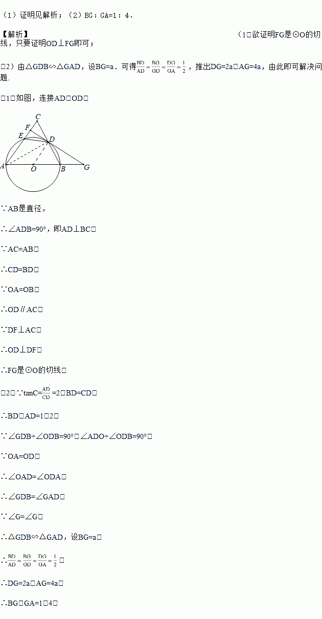 如图,△ABC中,AB=AC,以AB为直径的⊙O交BC于点D,交AC于点E,过点D作FG⊥AC于点F,交AB的延长线于点G.