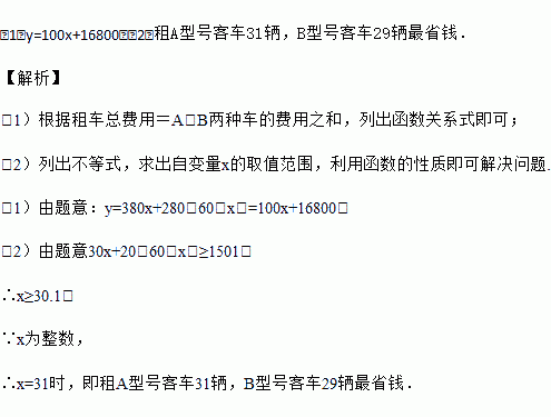 为树立“绿水青山就是金山银山”理念,在建设美丽中国的活动中,某社会团体组织1501名志愿者到相关部门规划的林区植树,决定租用当地租车公司共60辆A、B两种型号客车作为交通工具.下表是租车公司提供给该团体有关两种型号客车的载客量和租金信息.