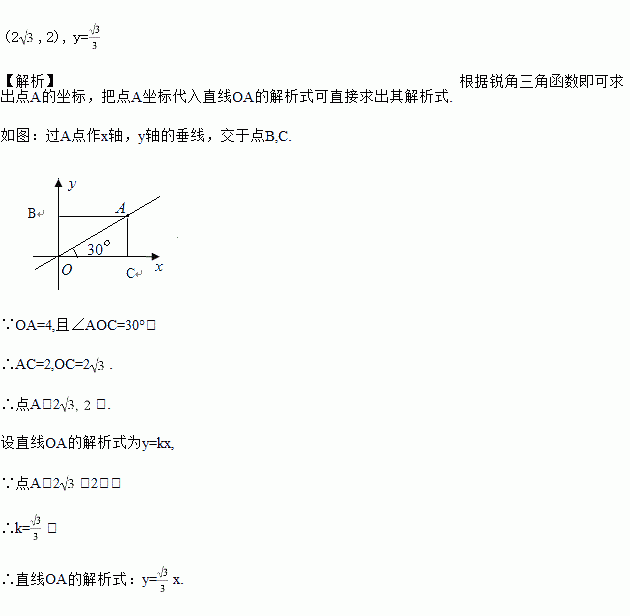 如图,在平面直角坐标系中,已知OA=4,则点A的坐标为____________,直线OA的解析式为______________.