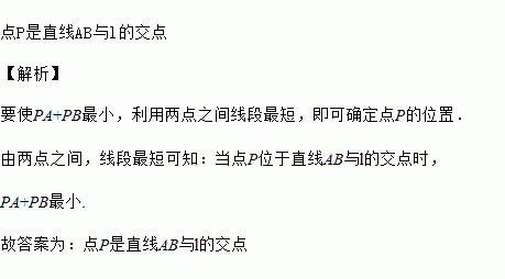 在直线l两侧各取一定点A、B,直线l上动点P,则使PA+PB最小的点P的位置是________