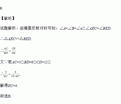 如图,CD是一平面镜,光线从A点射出经CD上的E点反射后照射到B点,设入射角为α(入射角等于反射角),AC⊥CD,BD⊥CD,垂足分别为C、D,且AC=3,BD=6,CD=12,则CE的值为( )
