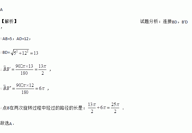 如图,矩形ABCD中,AB=5,AD=12,将矩形ABCD按如图所示的方式在直线l上进行两次旋转,则点B在两次旋转过程中经过的路径的长是( )