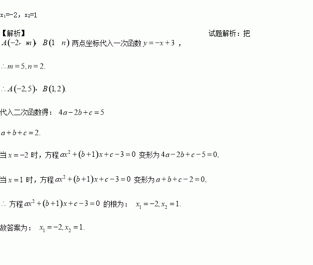 二次函数y=ax2+bx+c(a≠0)和一次函数y=-x+3的图象交于A(-2,m),B(1,n)两点,则方程ax2+(b+1)x+c-3=0(a≠0)的根为_______.