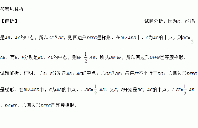 如图所示,△ABC中AD⊥BC,E,F,G分别为BC,AB,AC的中点.求证四边形DEFG是等腰梯形.