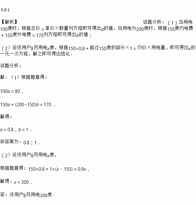 2017年5月份,该市居民甲用电100度,交电费80元;居民乙用电200度,交电费170元.