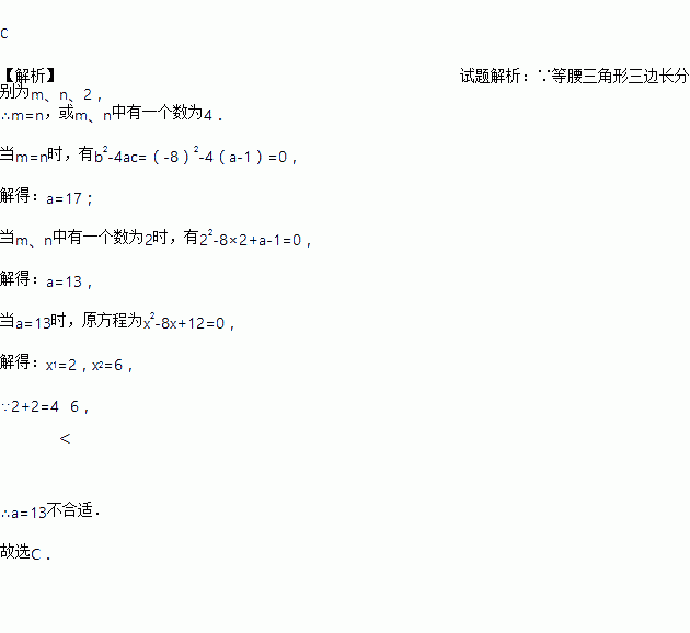 已知等腰三角形三边长分别为m、n、2,若m、,n分别是关于x的一元二次方程x2-8x+a-1=0的两个实数根,则a的值为( )
