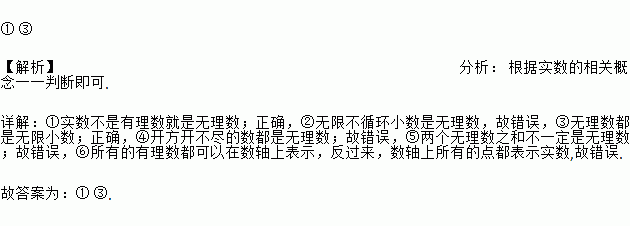 在下列语句中:①实数不是有理数就是无理数;②无限小数都是无理数;③无理数都是无限小数;④根号的数都是无理数;⑤两个无理数之和一定是无理数;⑥所有的有理数都可以在数轴上表示,反过来,数轴上所有的点都表示有理数.正确的是_______(填序号).