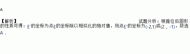 A 【解析】试题分析:根据位似图形的性质可得:E`的坐标为点E的坐标除以相似比的绝对值,则点E`的坐标为(-2,1)或(2,-1),故选A.