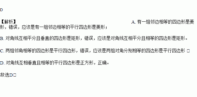 D. 对角线互相垂直且相等的平行四边形是正方形
