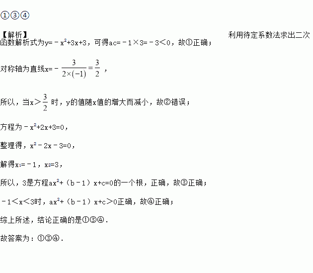 二次函数y=ax2+bx+c(a,b,c为常数,且a≠0)中的x与y的部分对应值如表:下列结论:①ac<0;②当x>1时,y的值随x的增大而减小;③3是方程ax2+(b﹣1)x+c=0的一个根;④当﹣1<x<3时,ax2+(b﹣1)x+x>0.其中正确的序号为_____