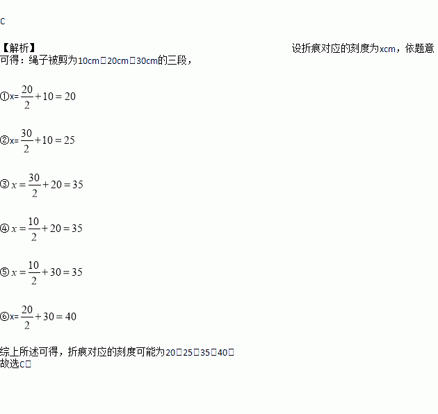 如图,将一段标有0~60均匀刻度的绳子铺平后折叠(绳子无弹性),使绳子自身的一部分重叠,然后在重叠部分沿绳子垂直方向剪断,将绳子分为A、B、C三段,若这三段的长度由短到长的比为1:2:3,则折痕对应的刻度不可能是( )