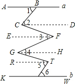 分析:分别过点C、F、G、T作直线a的平行线,故可得出AB∥CD∥EF∥GH∥RT∥KW,由平行线的性质可得出∠1=∠BCD,∠CFE=∠DCE,∠EFG=∠FGH,∠GTR=∠HGT,∠RTW=∠5,故可得出∠1+∠3+∠5=∠2+∠4+∠6.