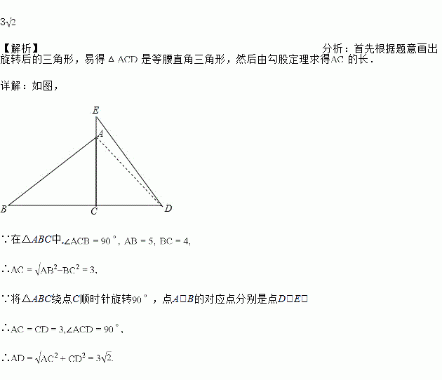 如图,在△ABC中,∠ACB=90°,AB=5,BC=4,将△ABC绕点C顺时针旋转90°,若点A、B的对应点分别是点D、E,请直接画出旋转后的三角形简图(不要求尺规作图),并求点A与点D之间的距离.